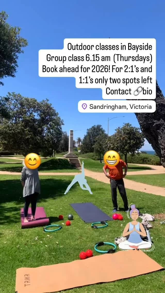 I offer my Pilates sessions in the heart of the Bayside Community in Melbourne, the sessions are held at various community centers. Additional sessions on the fingertips of the Mornington Peninsula: Langwarrin, Mount Eliza and at Mornington.
